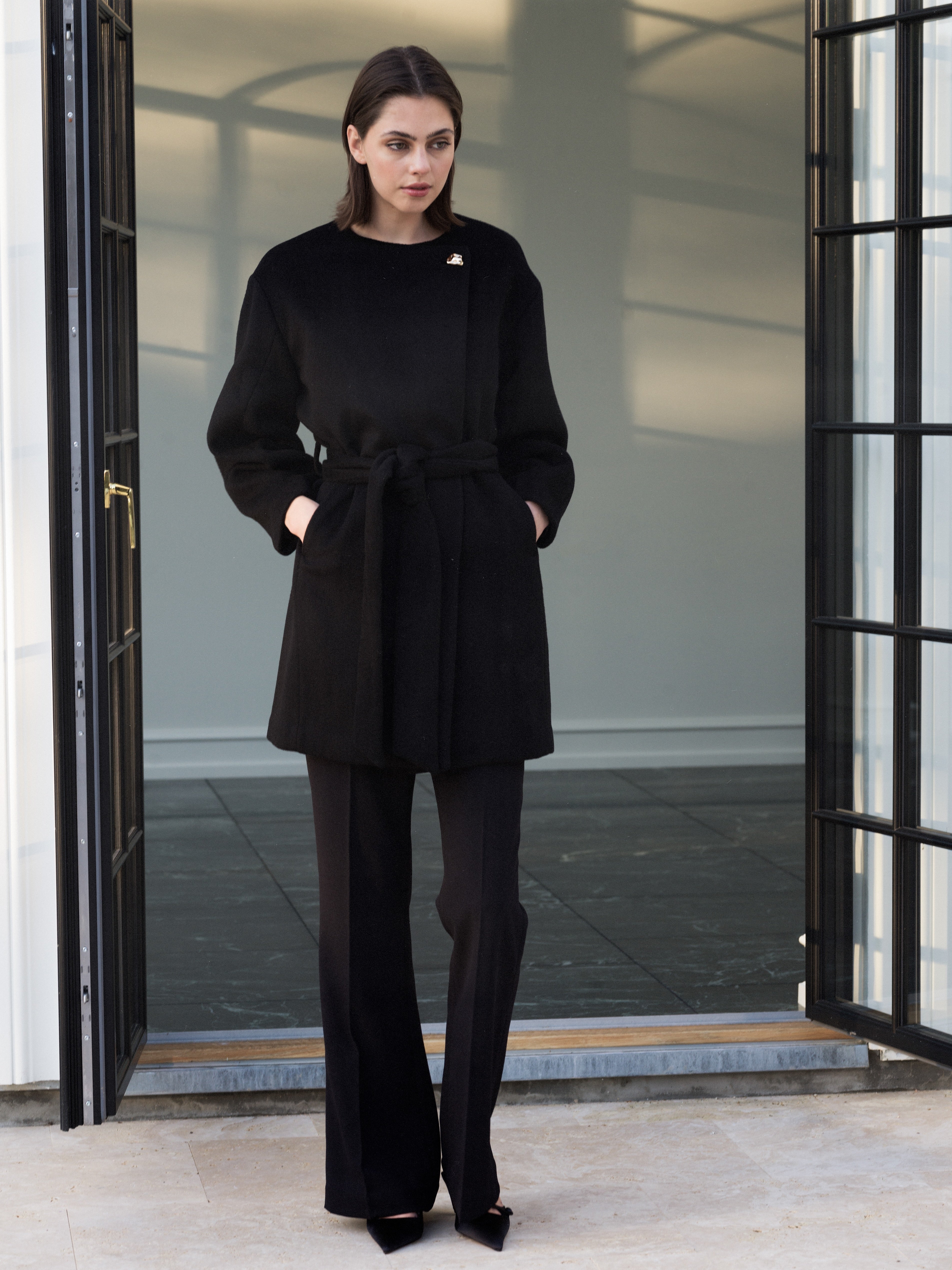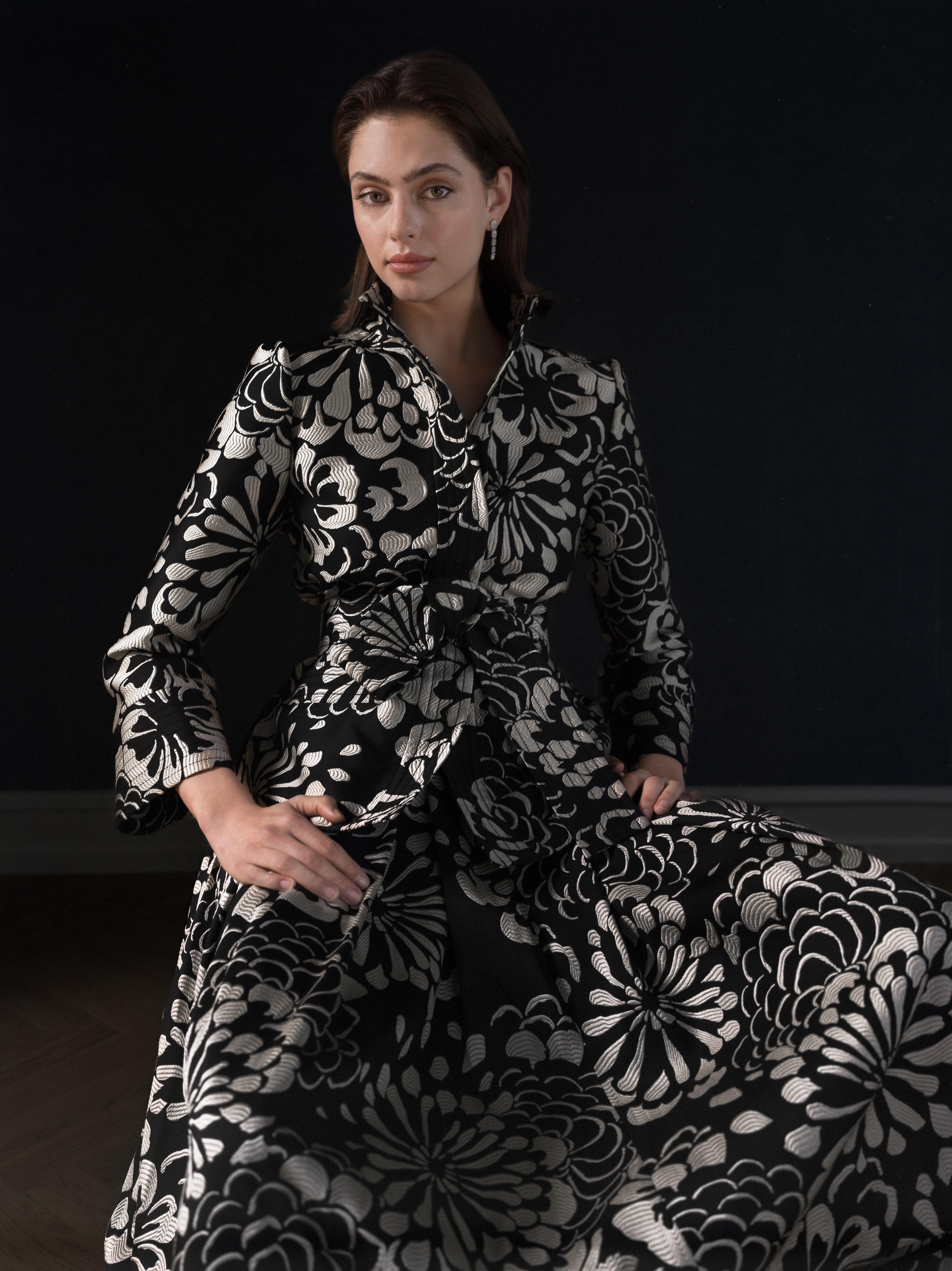 For a more dressed-up vibe, black makes a strong statement this season with an architectural sleeved blazer in deluxe cotton creating a bold silhouette when worn with a slightly cropped tapered pant. Vegan leather trousers, with the lustre of Asian lacquer, are chic with a sculptural leg shape whilst lightweight wool in jet black is sensuous in a body-skimming dress with a rouleau loop belt. And, as evening falls, a graphic chrysanthemum jacquard in black and white makes a stunning belted jacket and full skirt.