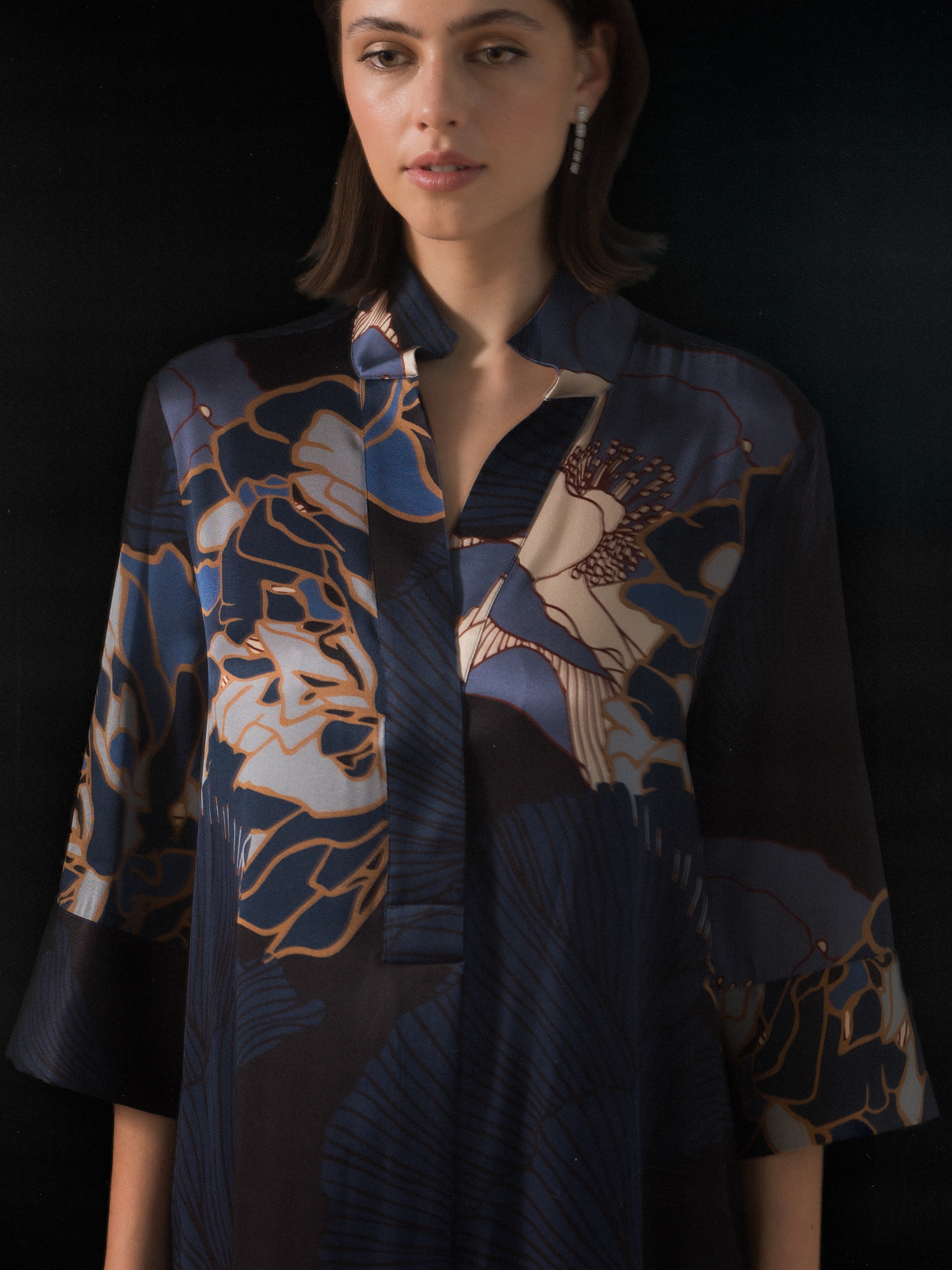 The timeless allure of the oriental world has always been an enduring inspiration for designers in the west, particularly at Dea Kudibal where the craftsmanship, style and understated elegance are reinterpreted with a Scandinavian sensibility to create something truly special. For this collection, the colour palette and prints look to the subtle beauty of a Japanese garden on an autumn morning with the flowers, leaves and trees seen through a mist that renders them soft and poetic. Delicate shades of rosewater pink, porcelain white, dove grey and pale blue capture the light when in signature silk blouses and give an air of sophistication to the many printed dresses. Bold kimono-inspired lotus blooms acquire a new sense of femininity when rendered in soft tones of blue whilst fern leaves in warm autumnal tones and chrysanthemum flowers mixed with paisleys on a jacquard base create equally beautiful effects. Elsewhere cherry blossom is recoloured into hues of indigo for a fresh take on an Asian motif.