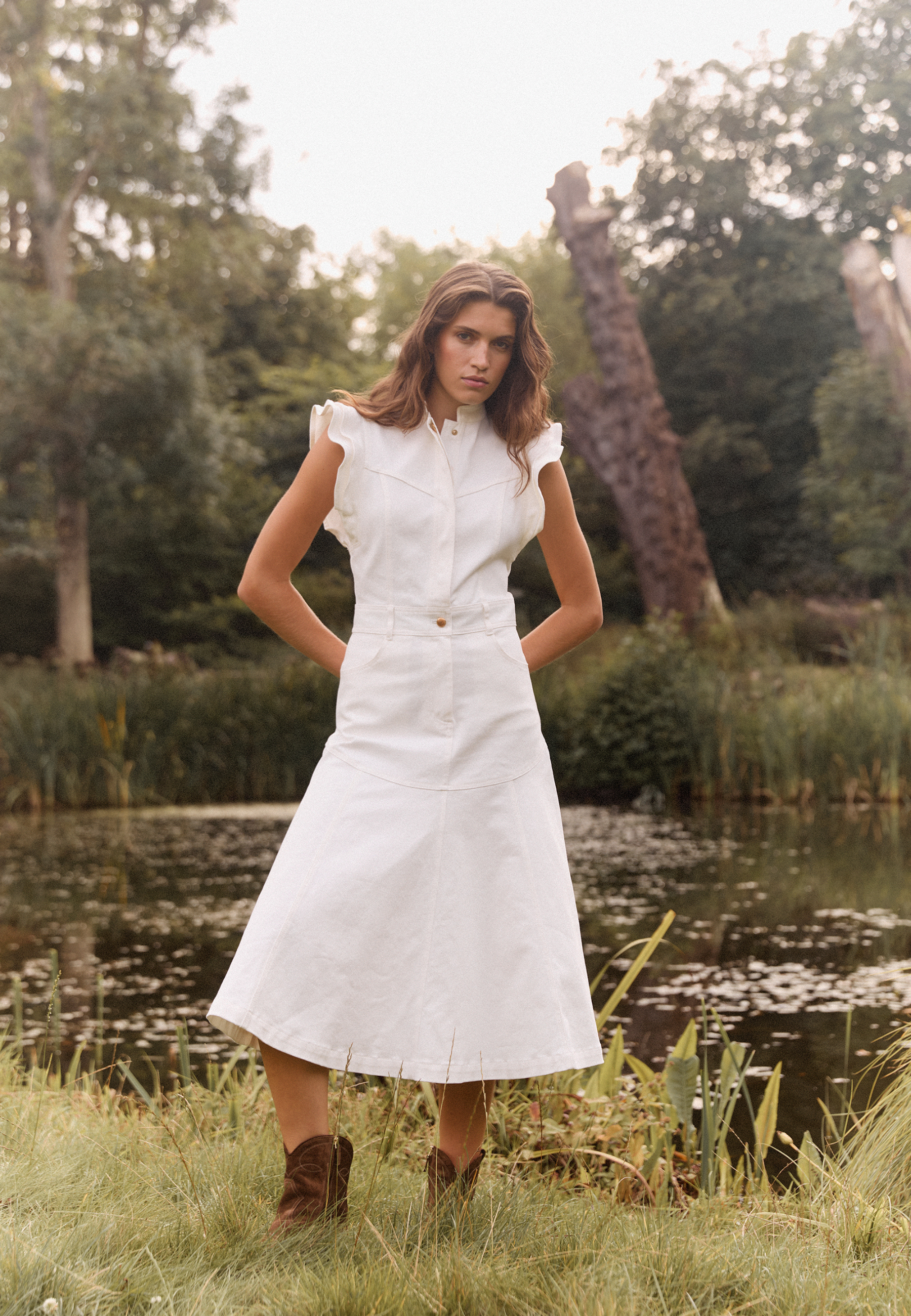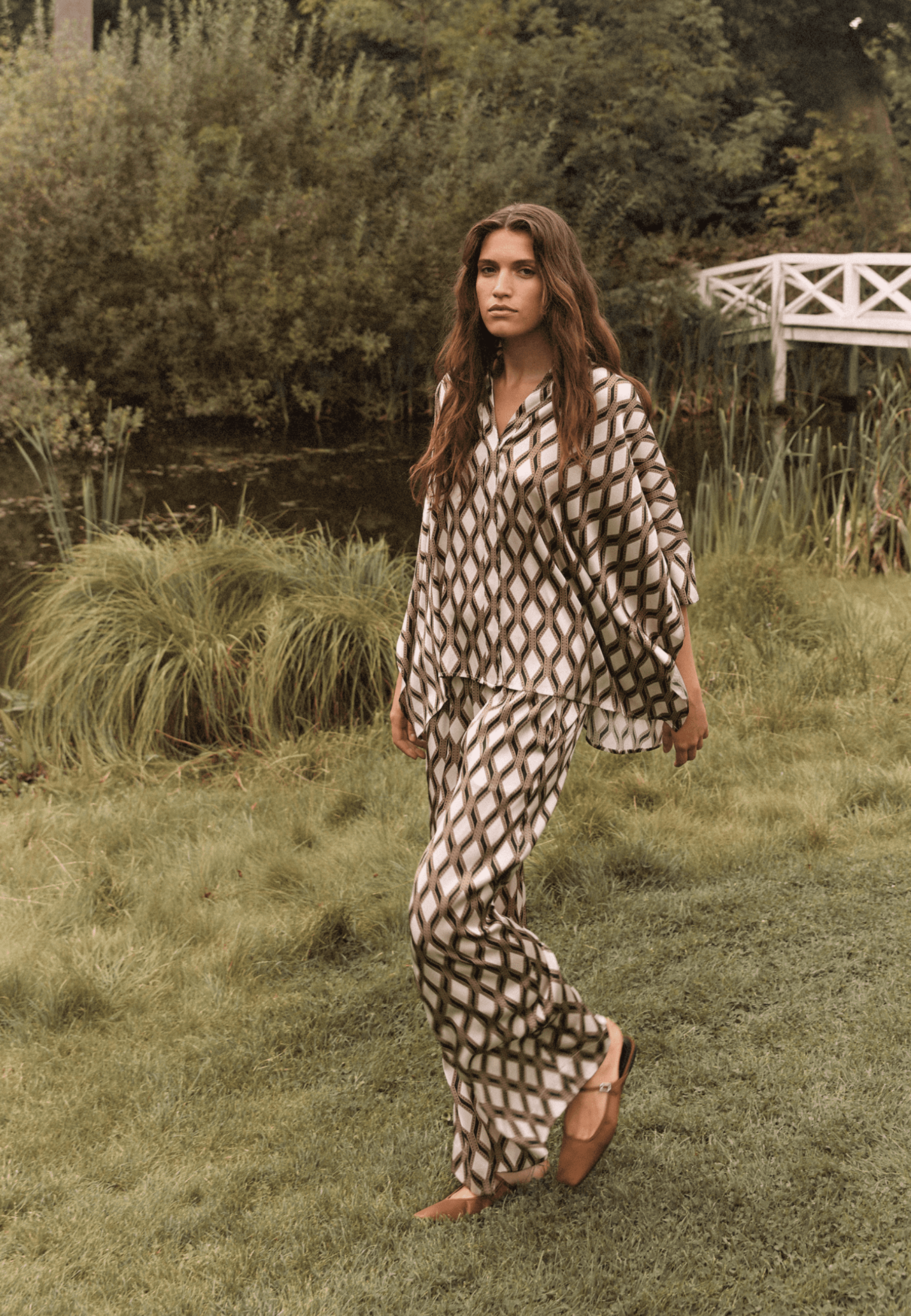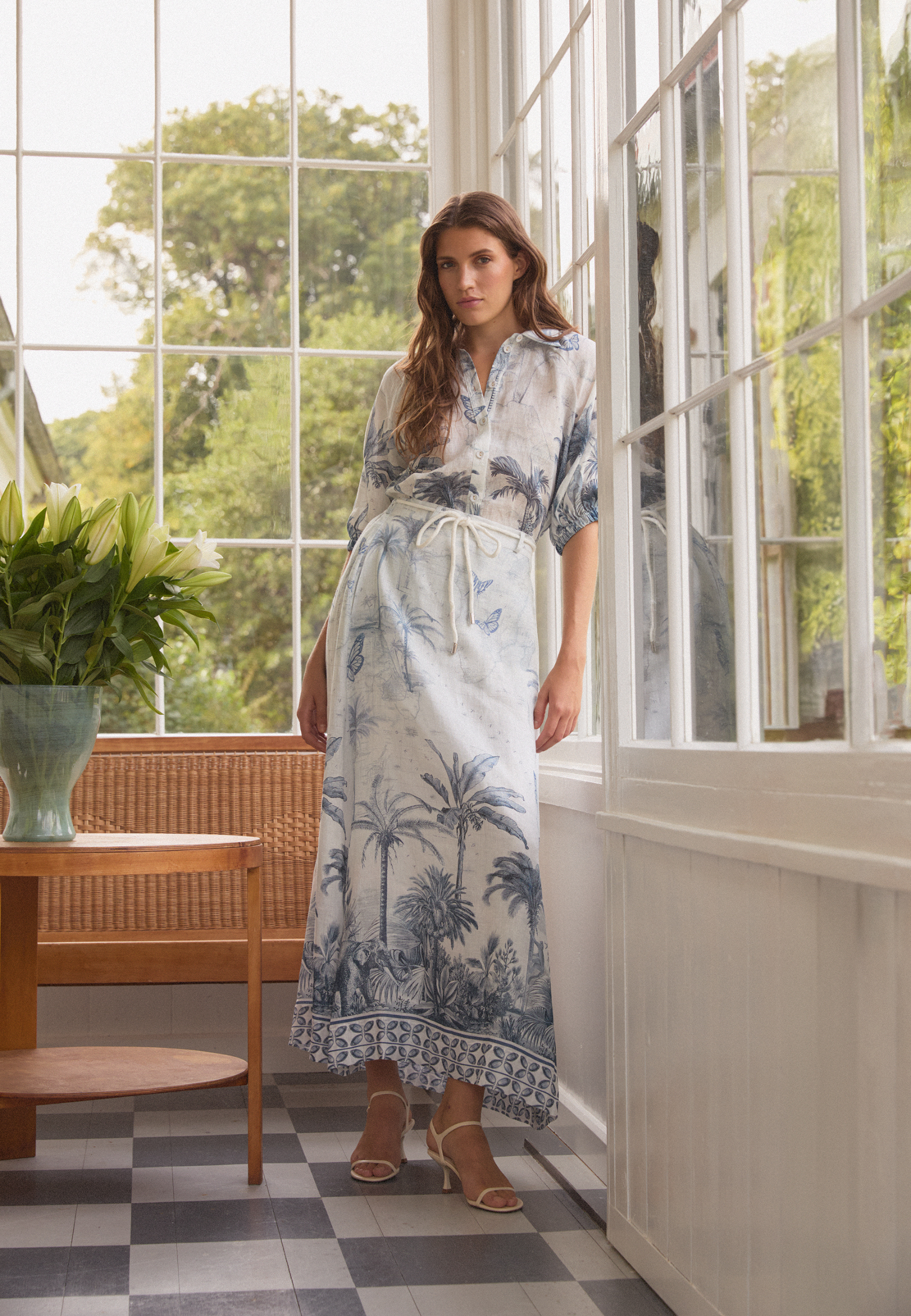 Reflecting the arid palette of her African home, the palette for Summer 25 places burnt red and vivid sky blue against natural sand, bone white and black. Dea Kudibal’s signature prints mix the artistic charm of a hand-painted tree of flowers, a bold ikat-inspired design and a delicate placement print depicting maps and wildlife whilst more graphic patterns are inspired by native basketwork. Fabrics are perfect for hot days and warm evenings: light cotton voile, trimmed with cut-out lace in a kaftan or long shirt with rope belt are stylish yet easy whilst white denim made into cropped pants or button-up dress with flounced sleeves mixes utility with femininity. Elsewhere a compact twill in savannah beige has a retro 70s vibe as a tie-belt safari dress or short sleeved shirt/jacket. Evenings have a touch of relaxed glamour in a floaty printed georgette dress with cut out shoulders or more high octane in a brightly coloured one sleeve top with oversized frill across one shoulder. Should the air chill as the sun goes down, pull on a pointelle lacy knit that offers a glimpse of sun-kissed skin with an exposed collarbone.