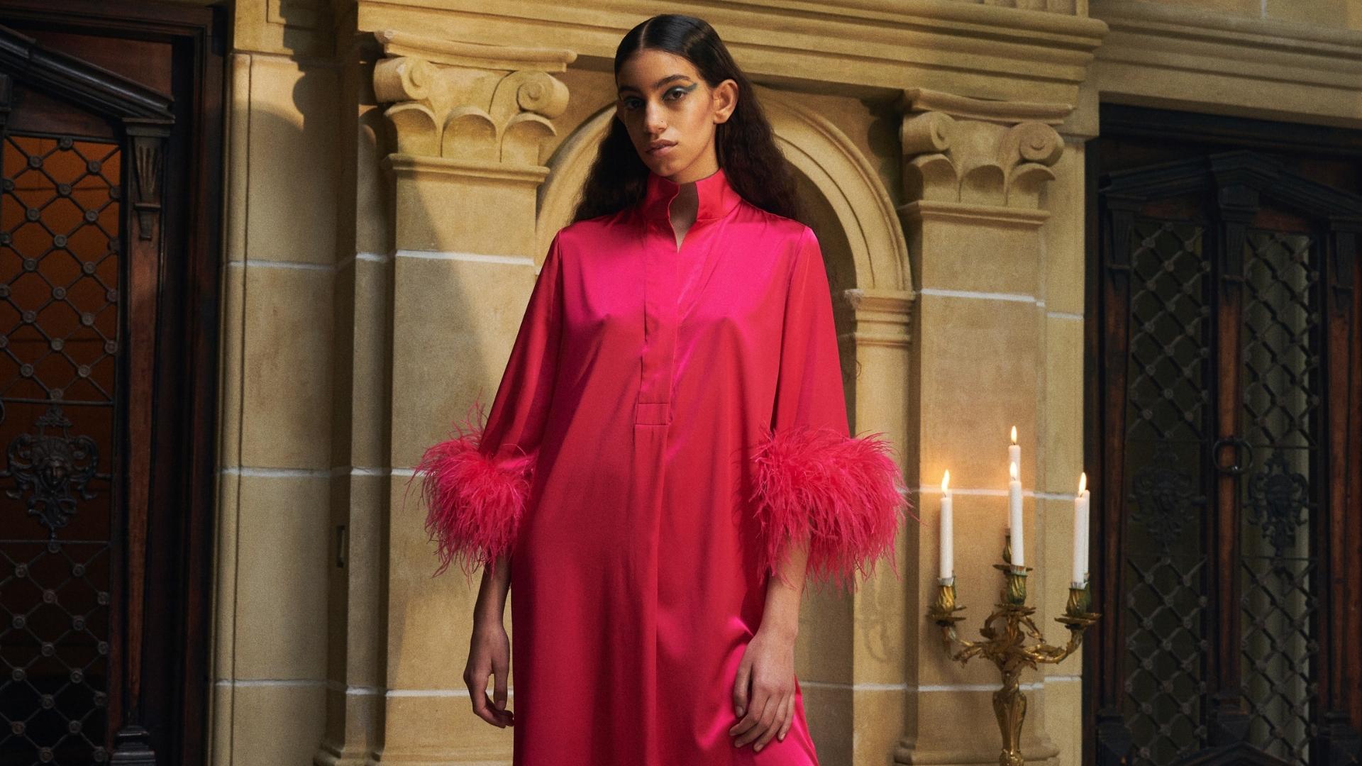 But for many women, a party means a dress and it is here that the magical effects of texture, shine, and embellishment appear. Gold cloqué jacquard gives a metallic sculptural quality to a short dress with huge sleeves whereas a gold-flecked crepe gown has a more ethereal quality. A statement black velvet column dress with sexy lace cut-outs running down the sides is based on Dea’s final project at tailoring school - a personal nod to the label’s heritage. Ostrich feather trims burst from the cuffs of a silky sleeve with an eye-catching effect and, for the ultimate in entrances, choose between a slinky black caviar sequinned dress with a high split skirt or a short platinum glitter version with the surprise of a deep scooped back.