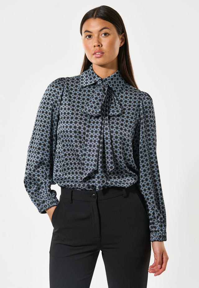 A DEA KUDIBAL classic, this elegant blouse in a small graphic printed silk makes a chic statement with the detachable bow at the neck. It has a regular fit with elasticated cuffs that create a small frill and there are covered buttons at the neck above a key hole slit at the front.