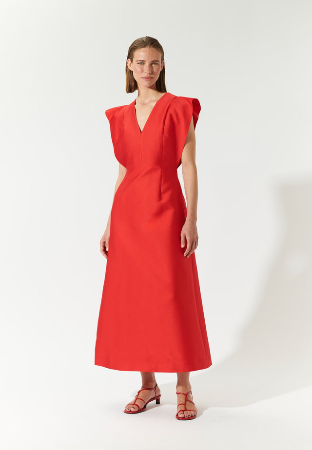 Bold sculptural frills at the shoulder give this taffeta party dress a dramatic and striking silhouette. Fitted at the top before flaring softly out into an ankle-length skirt, it has a deep V at the front. The chic red silk blend taffeta holds its shape whilst being soft and comfortable to wear.