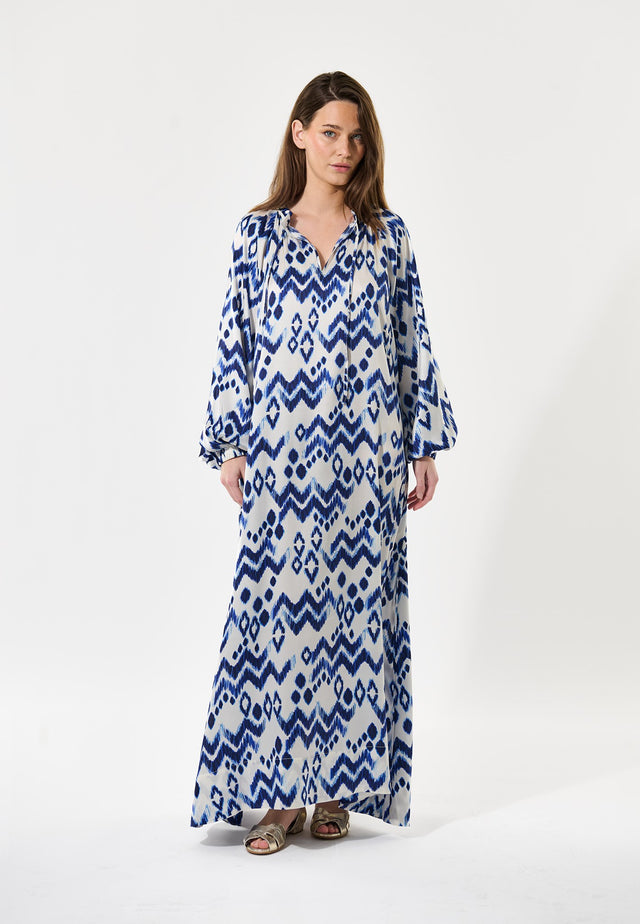 Stylish yet relaxed, this full length dress is perfect for summer. Its easy fit and flowing shape is made from silk printed with a batik-inspired design whilst a double frill forms a stand collar above a v-neck with string tie. The volume sleeves are finished with elastic cuffs that can be pushed up for a laid back attitude.