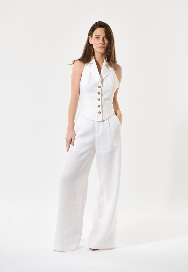 Effortlessly chic, this halterneck waistcoat with lapels in heavy white linen works perfectly with a pair of tailored trousers for evening. Totally backless, it is fastened by a tie belt at the waist.