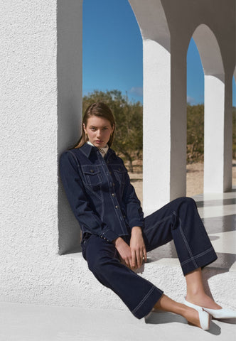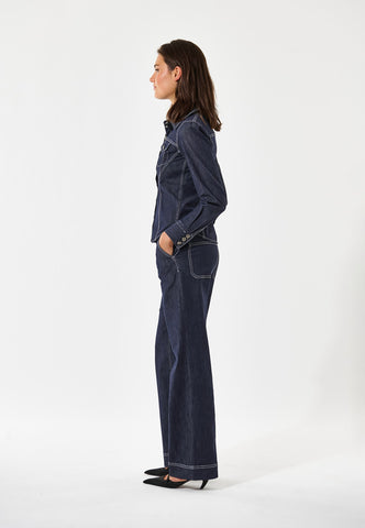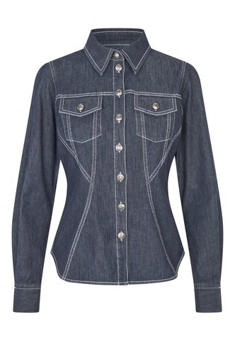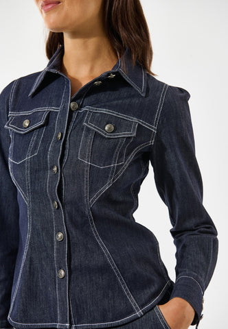 Contrast stitching accentuates a woman’s curves on this beautiful fitted denim shirt. Double stitching, flap pockets and metal logo buttons make it a contemporary take on a classic western style.