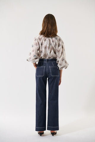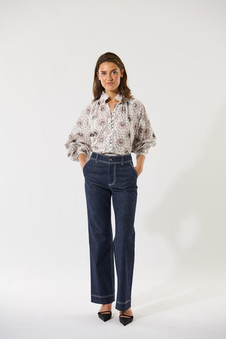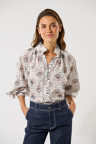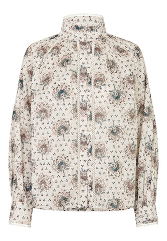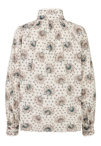 Delicate lace trim runs around the stand collar and cuffs and along the front placket and shoulder seams of this feminine and chic blouse. The cotton voile fabric printed with tiny bouquets of flowers adds to its charm.