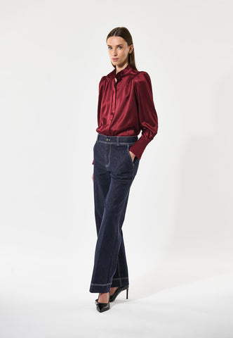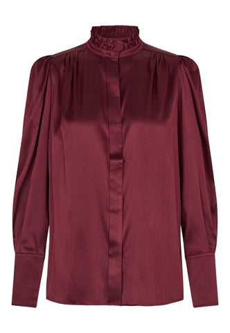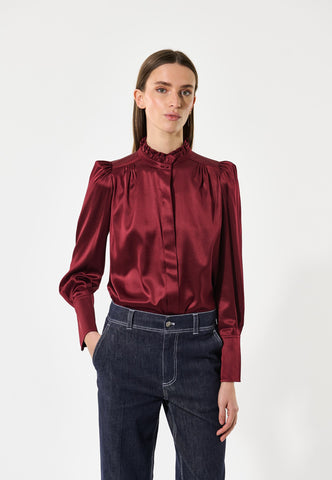 In rich burgundy silk twill, this fly front blouse has a high collar made from two rows of ruffles and shoulders accentuated by gathers and small shoulder pads. Tucks at the back give a little ease and comfort.