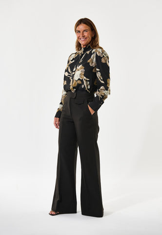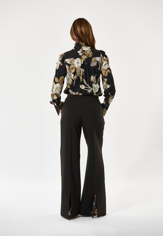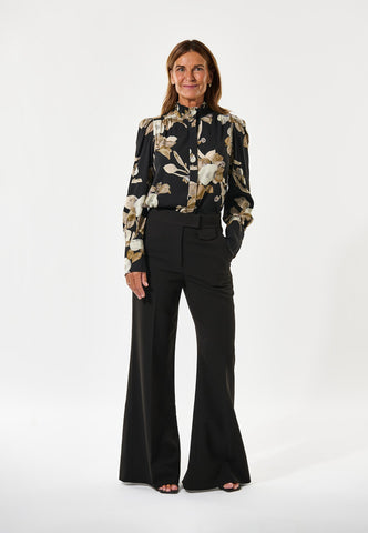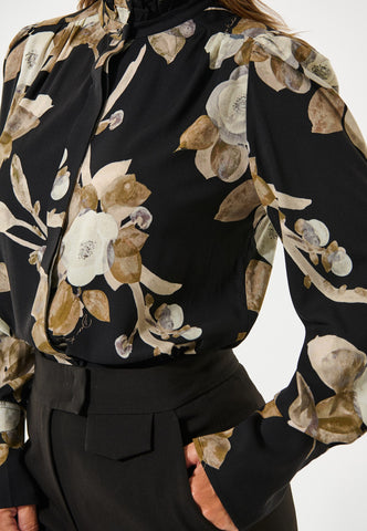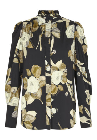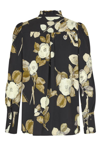 White camellia flowers are scattered across a black background on this fly front blouse. It has a high collar made from two rows of ruffles and shoulders accentuated by gathers and small shoulder pads. Tucks at the back give a little ease and comfort.