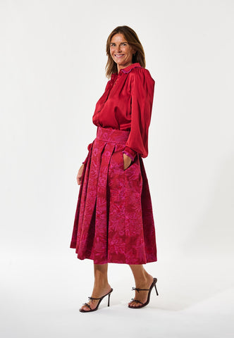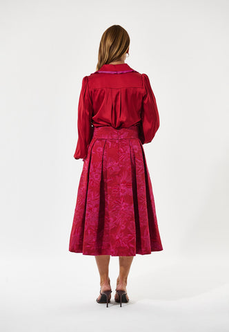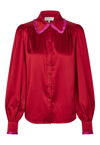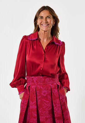 A tiny frill trim in bold fuchsia pink running around collar and cuffs adds a quirky detail to this bright red silk shirt. Fastened up the front with elegant covered buttons, the blouse has full sleeves and gathers at the front yoke.