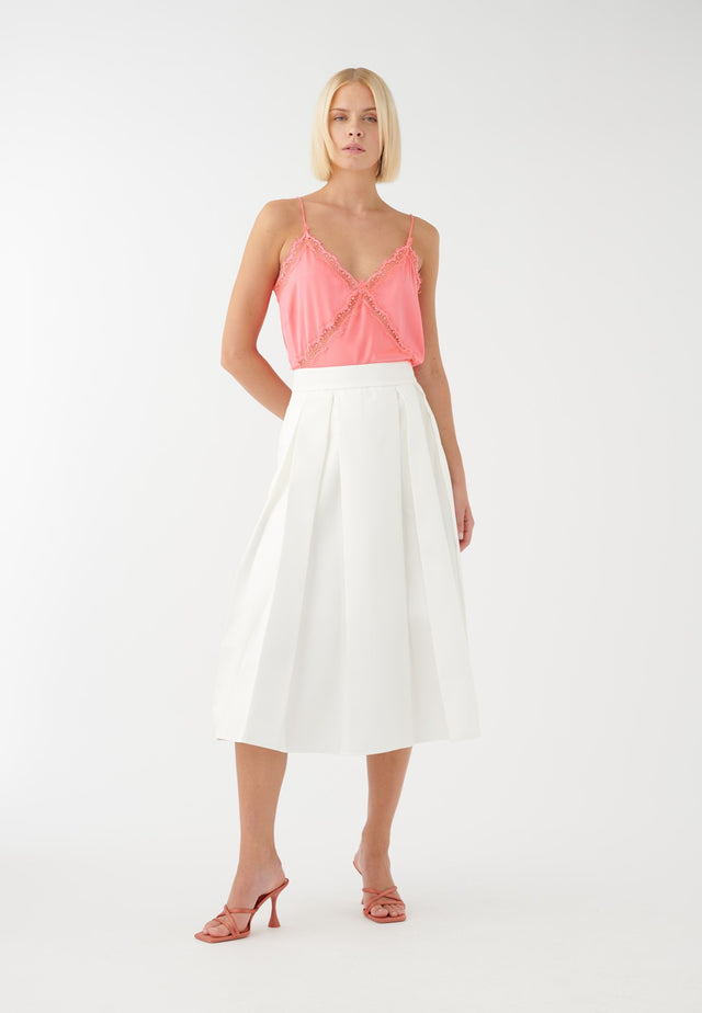 Giving a sleek and elegant silhouette, this flared skirt with deep pleats in white taffeta can be dressed down with a t-shirt or matched with a blouse for the evening. Pockets at the side give it a sense of ease.