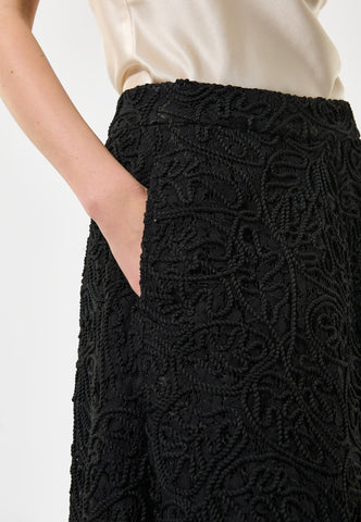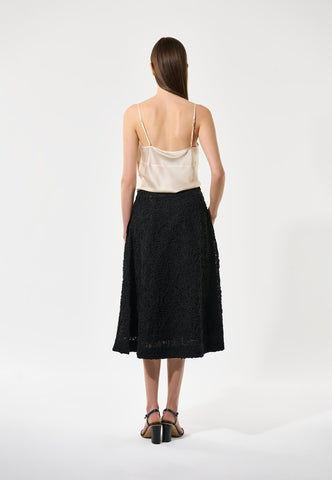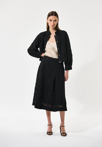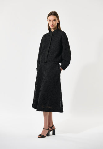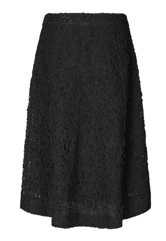 Fitted at the hips before flaring into an elegant A-line that falls to mid-calf, this skirt allows the gorgeous black lace to take centre stage. A large pleat in the front allows easy movement and there is a concealed zip at the centre back. The skirt is fully lined.