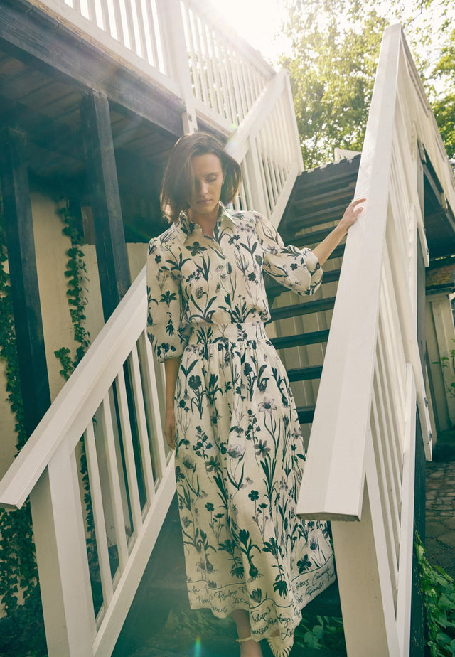 Feminine and relaxed for a summer day, this stylish linen skirt in a bold print of botanical drawings falls from a wide, high waistband to a full flared shape that ends at mid calf. A border of handwritten script adds an interesting detail. It is fully lined and there are side pockets to give an easy attitude.