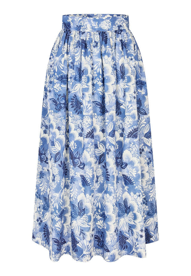 Chic and comfortable for a summer day, this feminine linen skirt in a bold blue floral print falls from a wide, high waistband to a full flared shape that ends at mid calf. It is fully lined and there are side pockets to give an easy attitude.