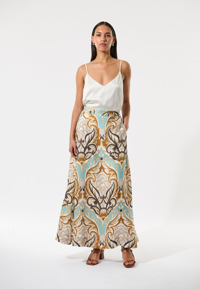 With its flowing Art Nouveau inspired placement print, this flared skirt in linen is perfect for summer. Falling to mid calf, it has a self-fabric tie belt as an elegant finishing touch.