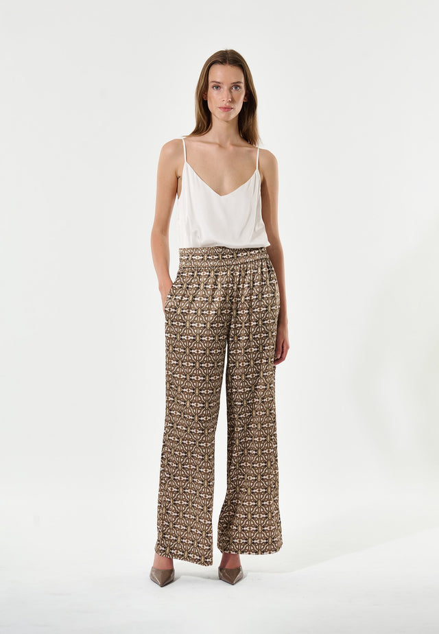 Gathered onto an elasticated waist and with a regular fit straight leg, these silk pants in a stylish graphic print are the perfect easy trousers to match with a shirt or knit top for either day or evening. Side pockets give an extra element of ease.