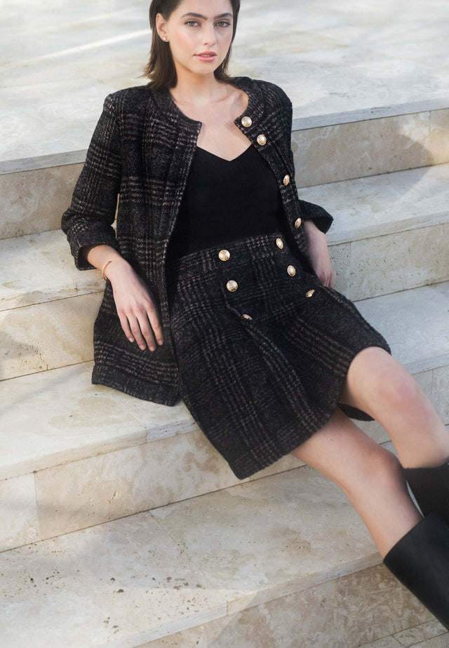 Made from a chic bouclé checked fabric, this short pleated skirt is stylish and fun. It is pleated into a waistband and decorated with six decorative brass buttons. It has pockets in the side, a zip closure at the back and it stops just above the knee.