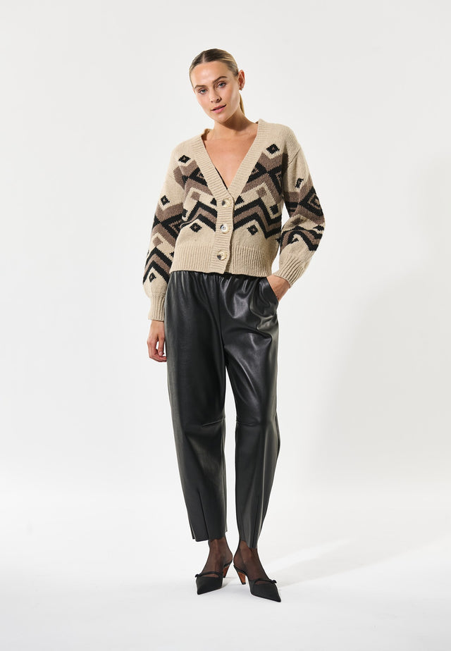 Striking with its bold graphic design, this hand knit intarsia cardigan is a celebration of craftsmanship. Cut short with a V neck and deep ribs on the full sleeves, it is fastened by three large buttons.