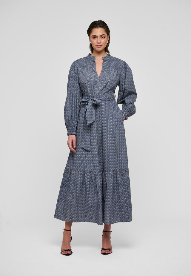 A single row of frills forms a stand collar on this elegant summer dress in cotton voile with a small floral print. Little tucks gather the body fabric into the front yoke and then falls to a long flounced skirt that is pulled into the waist with a self fabric tie belt. Volume sleeves finished with frilled cuffs add to the feminine silhouette.
