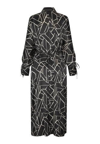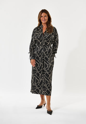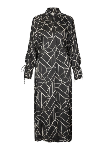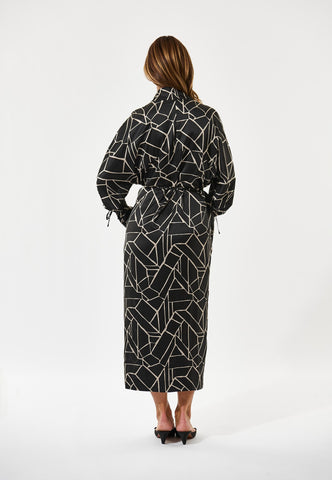 A high stand collar and cross-over neckline add an elegant attitude to this dress fashioned from silk printed with a bold monochrome graphic print. The regular fit body falls to mid calf and is pulled into the waist with a fine cord that can be tied at the front or back. Similar ties are stylish finishing touches to the full raglan sleeves.