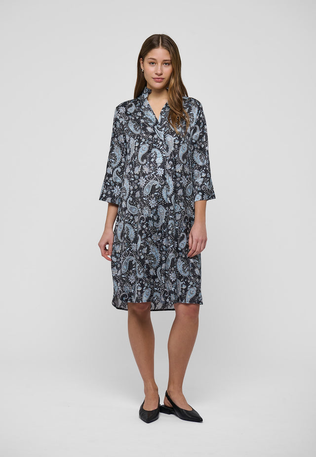 Truly one of Dea Kudibal’s most popular and timeless styles, this easy fit mid-calf length dress is perfect for all body shapes. The kimono neckline and collar give it an elegance whilst the deep sleeves with cover buttons have a relaxed air. This beautiful version is in black silk printed with an allover design of blue paisleys.