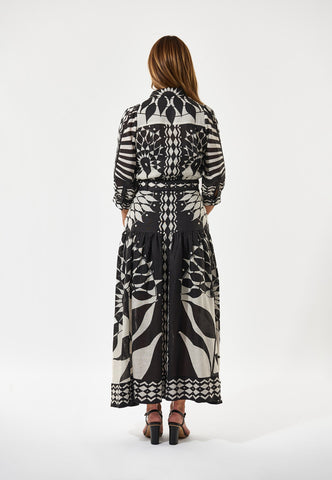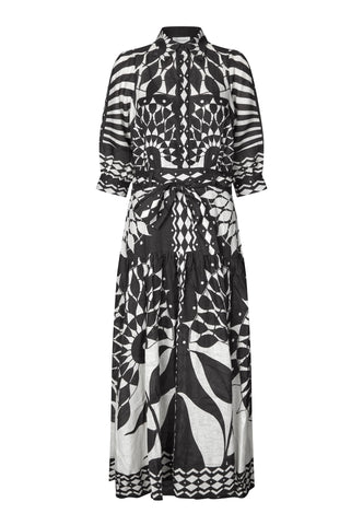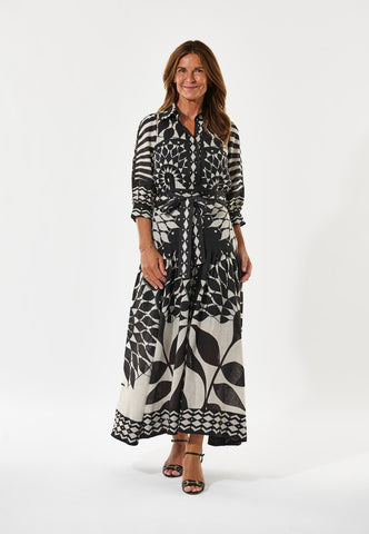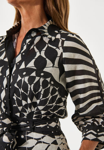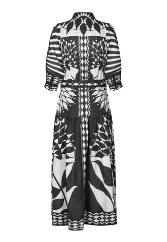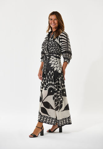 A bold graphic print in black and white gives this full length printed linen dress real impact. A fitted top with neat shirt collar and 3/4 length sleeves with a half placket with covered buttons opens into a wider flounced skirt below a waist which is defined by a self fabric tie belt. The dress fastens by a zip at the side.