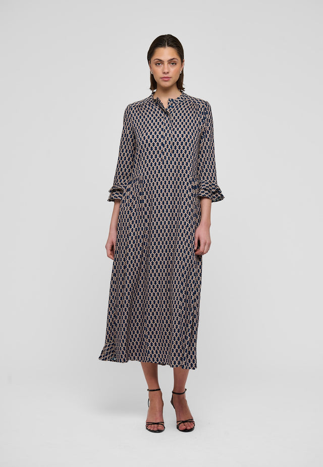 A small graphic print on viscose crepe gives this ankle-length dress with 3/4 sleeves a sophisticated air - it is both classic and very chic. There are double ruffles on the cuffs and at the back hem and gathering on the sleeves.