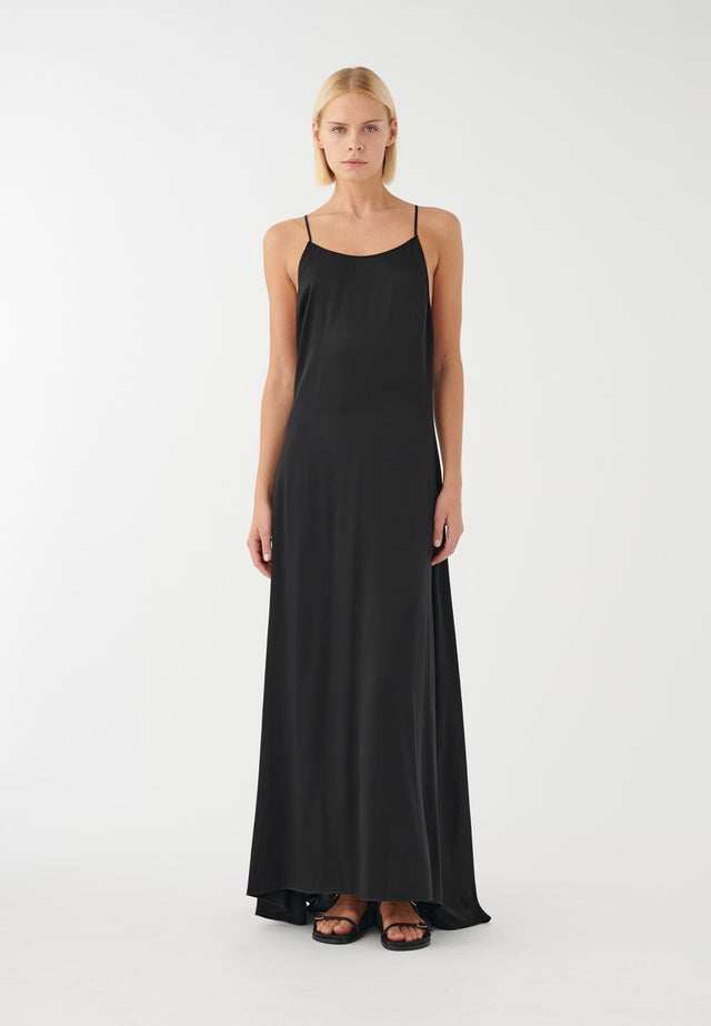 Elegant and chic, a silk slip dress is a classic option for a summer evening. This full length version in jet black hangs from delicate spaghetti straps before skimming the body and flaring to the hem.