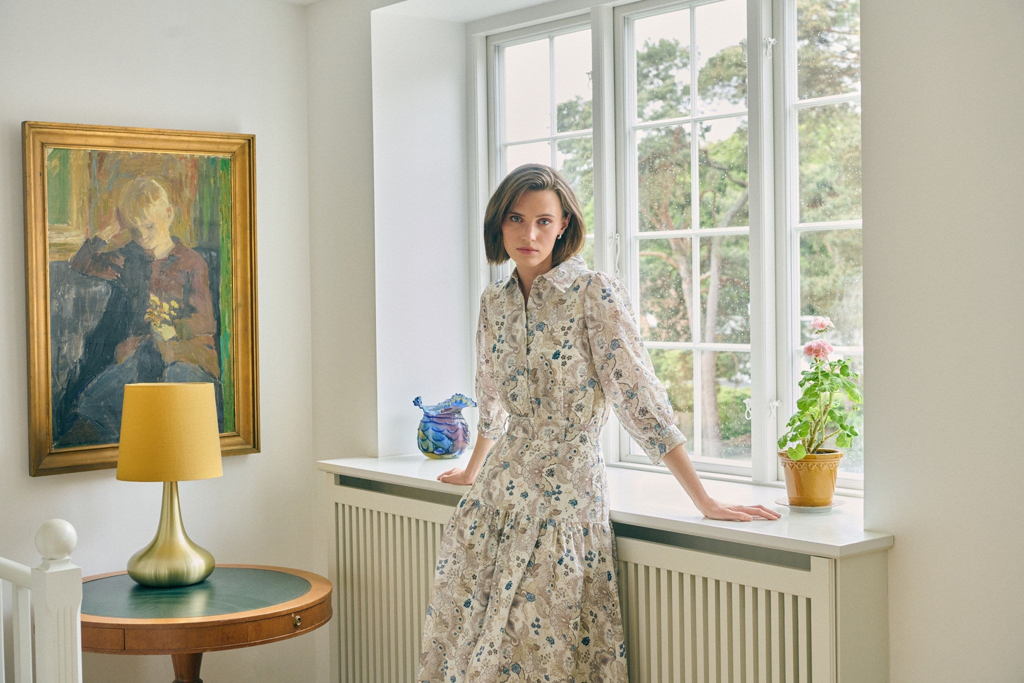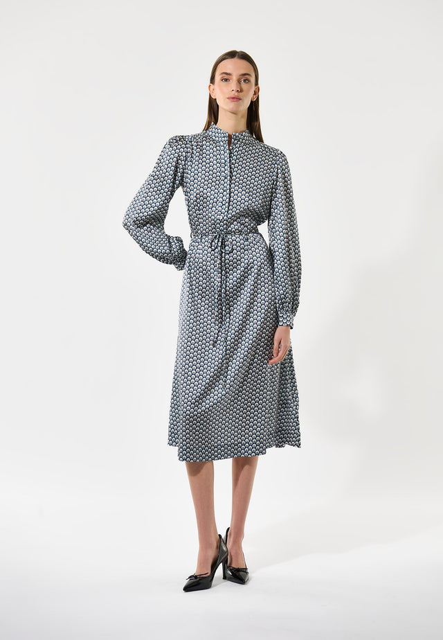 Fitted at the body and then flaring out to an A-line mid calf length skirt, this dress in silk printed with a graphic, optical design is flattering and chic. It has a stand collar, full sleeves that end with a buttoned cuff and a self fabric belt finished with metal ends. The dress is fastened with a hidden side zip and a front placket with covered buttons.