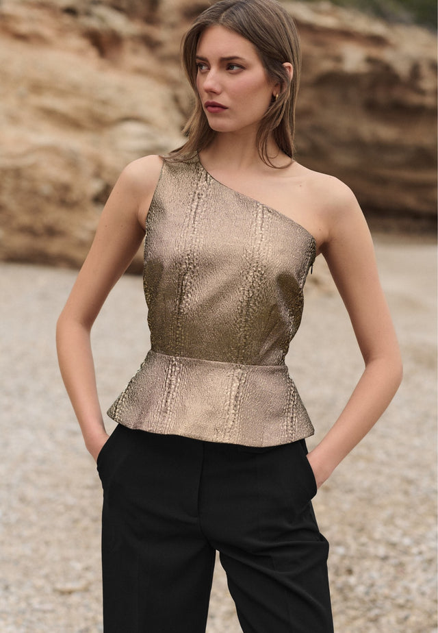 Crafted from a textured metallic brocade in a burnished gold colour, this one-shouldered top adds a bit of sophisticated glamour to the evening. Fitted close to the body, it has a seam at the waist from which it flares out over the hips. The top fastens with an invisible zip at the side.