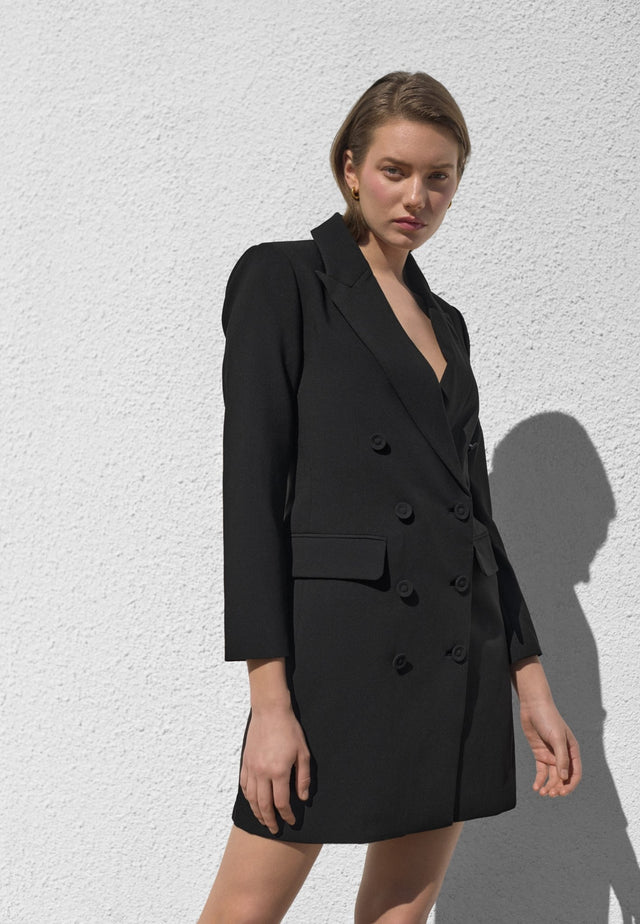 Expertly tailored like a jacket but worn as a short dress, this is a sophisticated and stylish take on a classic tuxedo. The double breasted fastening, wide spear lapels and covered buttons on the fitted shape are elegant and refined, especially in the jet black viscose blend crepe fabric. It is fully lined with printed monogram lining.