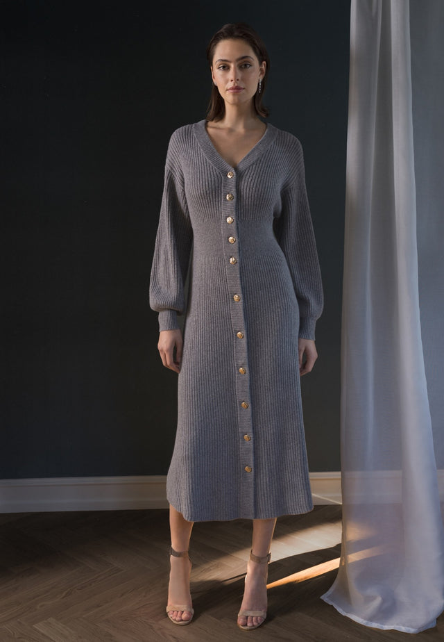 Long and lean, this luxurious grey knitted dress is fitted on the body before flaring gently to fall to ankle length. Made from a soft wool mix yarn, the dress has a deep V neck, ribbed detail at the waist and cuffs and is buttoned down the front with textured metallic buttons.