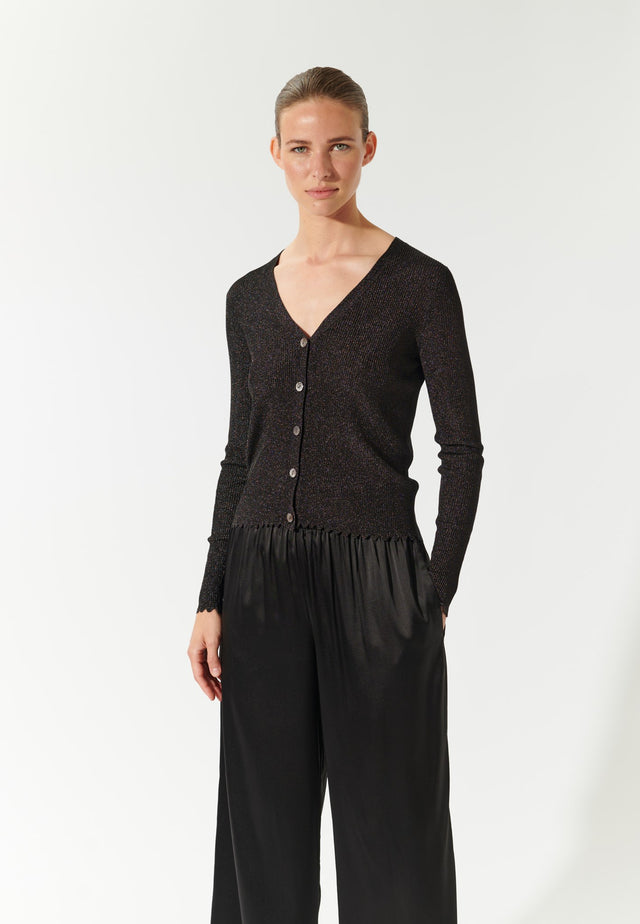 This tight-fit ribbed cardigan with mother of pearl buttons is the perfect cover up for a chilly evening. A scalloped edge around the hem and cuffs along with a touch of lurex running through the deep brown fabric both add a feminine touch. Can be worn with the matching Chica top to create a stylish and contemporary twin-set.