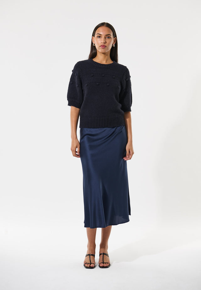 Neat and chic, this fitted sweater in navy blue cotton/wool blend has short puff sleeves that give it a somewhat vintage retro vibe. The horizontal textured stripes feature 3D dots that add a subtle detail to the jumper.