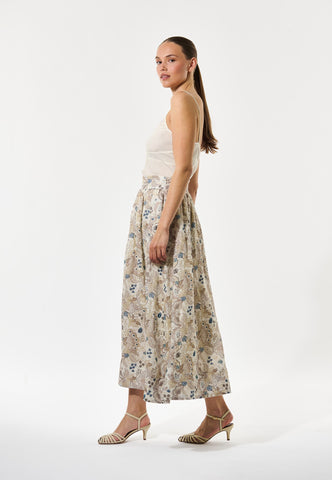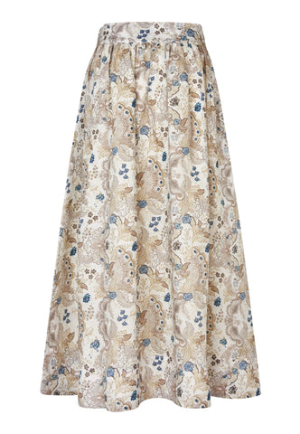 Feminine and comfortable for a summer day, this beautiful linen skirt in a pretty floral print of natural shades falls from a wide, high waistband to a full flared shape that ends at mid calf. It is fully lined and there are side pockets to give an easy attitude.