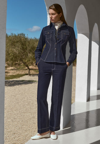 Contrast stitching accentuates a woman’s curves on this beautiful fitted denim shirt. Double stitching, flap pockets and metal logo buttons make it a contemporary take on a classic western style.