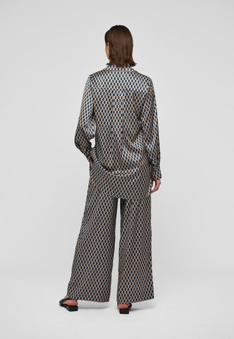 Wide leg pants in silk are a favourite summer style and this pair in a small latticework graphic print with a wide elastic waistband are a chic example. Wear with a simple top or a knit for an effortlessly elegant outfit.