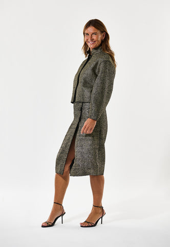 Minimal details on this beautiful jacket allow the stunning gold bouclé fabric make the real statement. Closed with a fly front and snap stud fastenings, the jacket has a stand collar, sculptural sleeves and is cropped to finish at the waist. To make a truly glamorous outfit, pair with matching Gigi skirt.