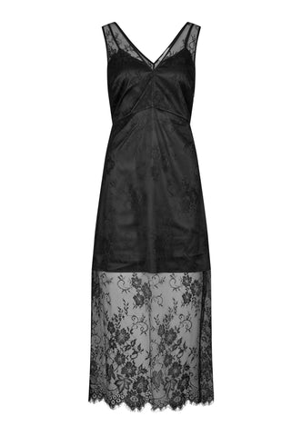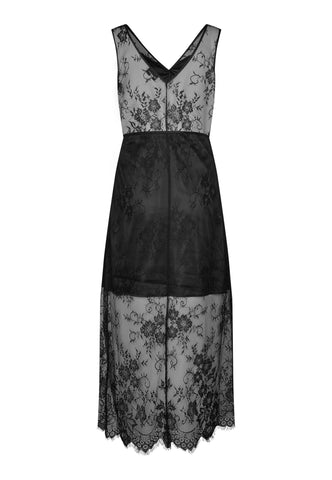 The very definition of feminine party wear , this slim fit ankle length in black lace skims the body before flaring out gently. Scalloping at the hem adds a refined detail and the dress comes with a black slip to be worn underneath.