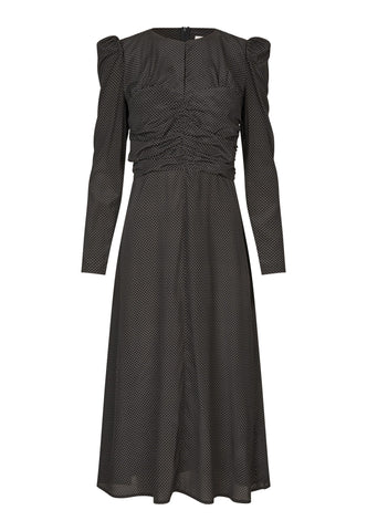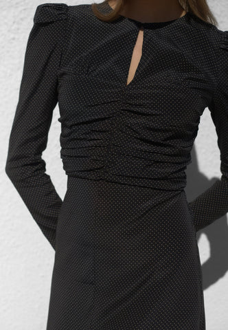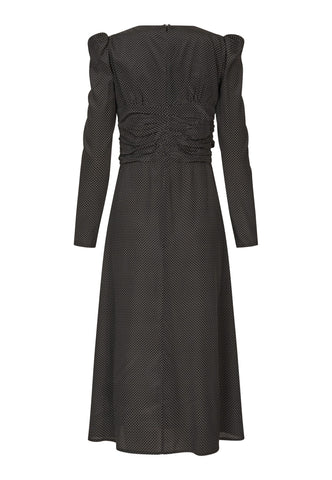 Delicate ruching pulls in the pin spot silk fabric on the bodice of this dress creating a body skimming style that falls in a slightly flared skirt to just below the knee. Puffed shoulders with removable shoulder pads on the long slim sleeves adds to the silhouette whilst a key hole opening at the front gives a glimpse of skin. The dress is fastened by a concealed zip at the back.