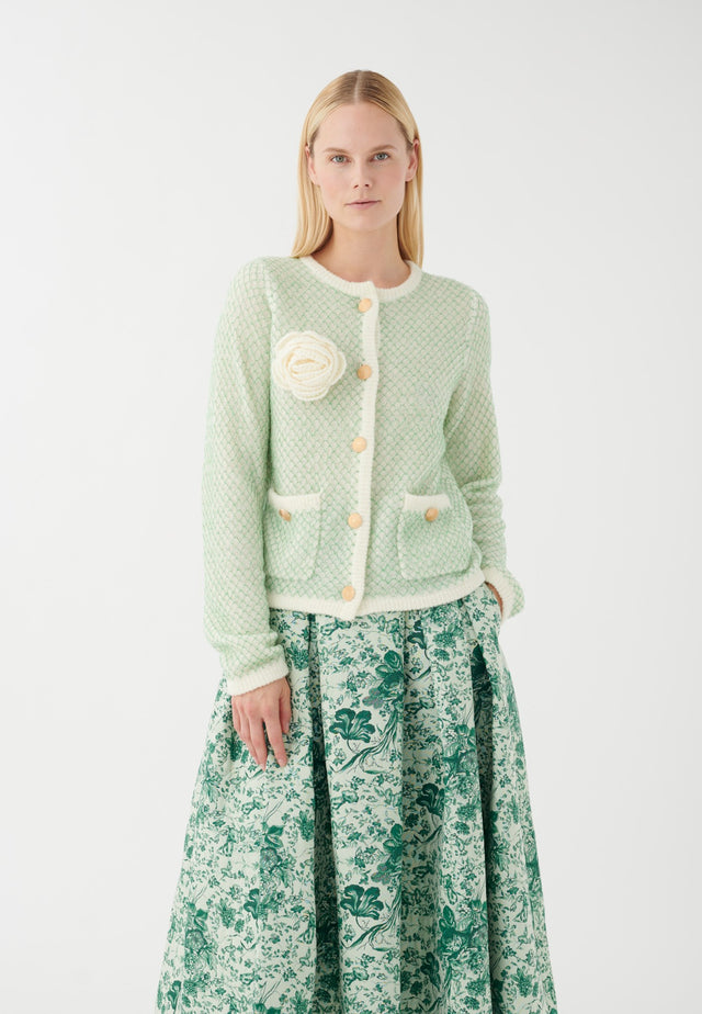 An updated version of a classic tweed jacket, this cardigan is both elegant and timeless. Boxy in shape, the textured knit in pale green is framed with a cream border whilst patch pockets, brass buttons and a knitted corsage flower add the perfect finishing touches.