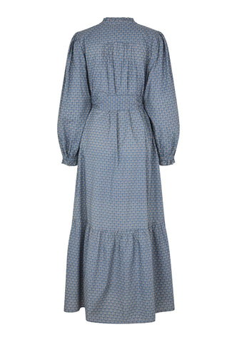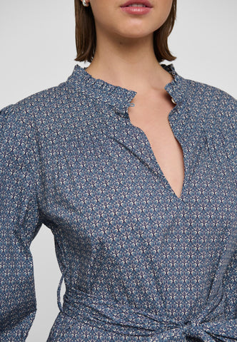 A single row of frills forms a stand collar on this elegant summer dress in cotton voile with a small floral print. Little tucks gather the body fabric into the front yoke and then falls to a long flounced skirt that is pulled into the waist with a self fabric tie belt. Volume sleeves finished with frilled cuffs add to the feminine silhouette.