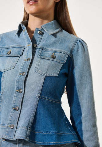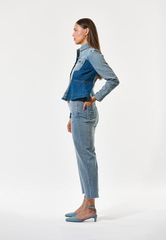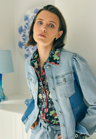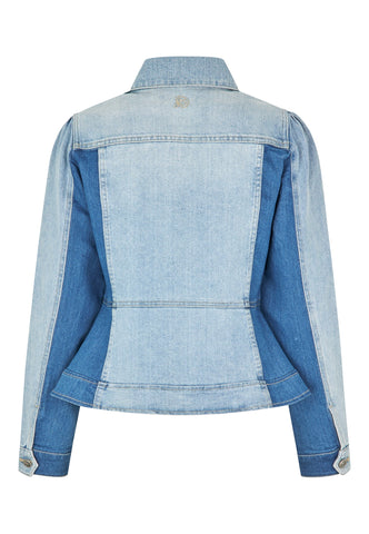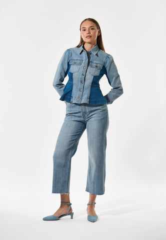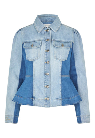 Pale washed denim is artfully combined with darker blue denim in this bold take on a jeans jacket. The shirt collar, metal buttons and western style flap pockets give it a workwear vibe whilst the fitted shape flares out over the hips to bring an element of femininity. A small logo is embroidered at the centre back.