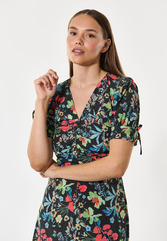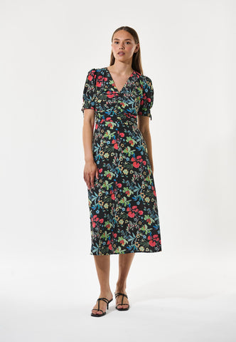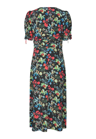 Small pleats at the waist are used to create a chic fitted silhouette on this V-necked silk dress that falls to mid calf. The joyful print of bright flowers on a black background add an extra feminine appeal as do the short full sleeves that are held closed with self fabric tapes.