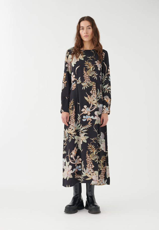 The relaxed fit of this raglan sleeved viscose dress is a perfect canvas for the bold print of exotic flowers strewn across a black background. Falling to mid calf, the dress has a round collar and long sleeves.