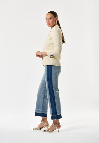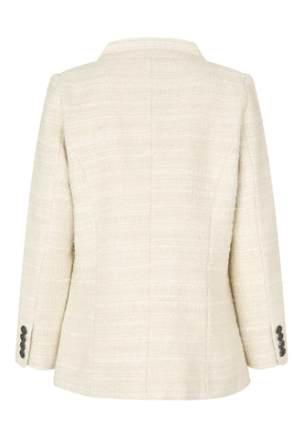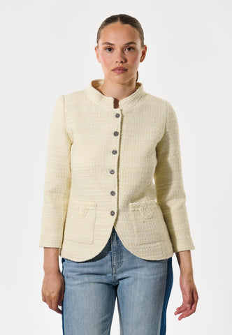 A classic addition to any wardrobe, this stand collar jacket in cream wool blend bouclé fabric is chic and stylish. Regular in fit, it falls to hip length, has two patch pockets and is fastened with a row of metal buttons bearing a rose motif.