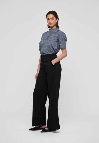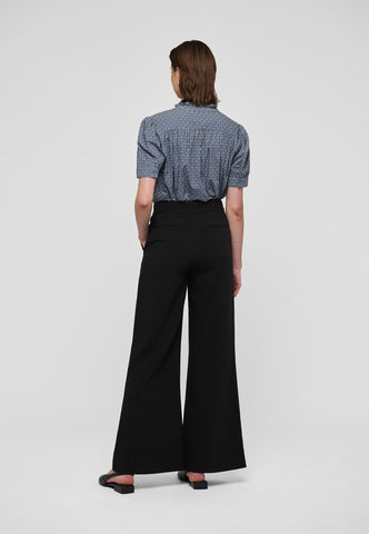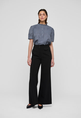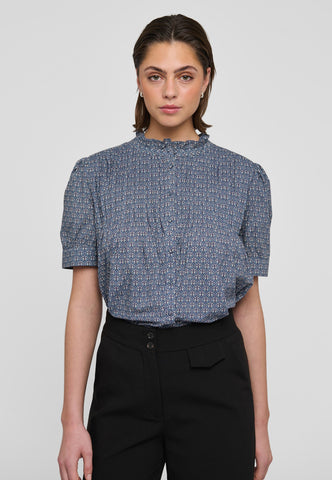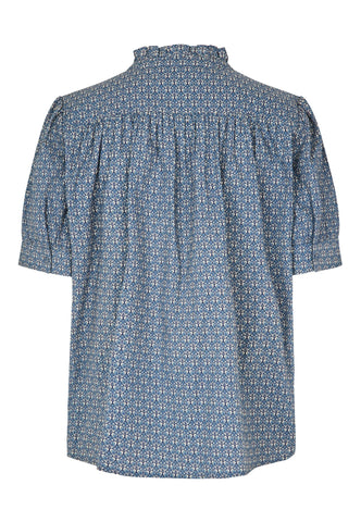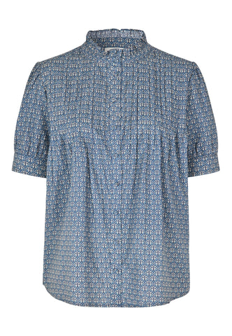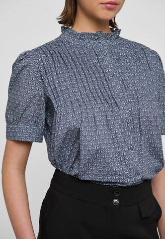 Tiny tucks run across the front of this charming and pretty short sleeved blouse. A frill stand collar adds to the allure as does the print of small blue flowers on soft cotton voile fabric.