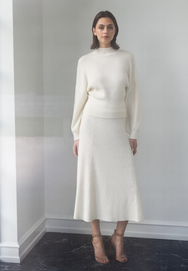 Cosy and stylish, this mid calf length knit rib skirt fits close to the hips before flaring out with delicate fashioning details. It has an elasticated waist for additional comfort and is made from a blend of wool, cotton and cashmere in a rich cream colour.