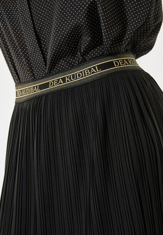 Mixing both sporty and classic, this flared skirt in black has a tight fit elasticated logo waistband that holds multiple deep pleats that are sewn down until the hip before flaring out to the mid calf. It is fully lined.