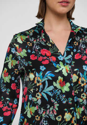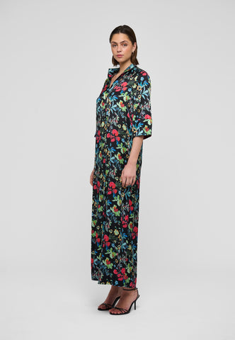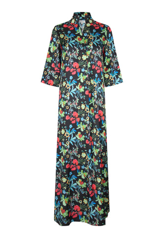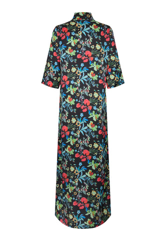 An eternally popular Dea Kudibal classic, Helga is a relaxed fit full length dress with a kimono style neckline, stand collar and 3/4 length wide sleeves. This version comes in silk with a print of multicoloured flowers scattered across a dark background.