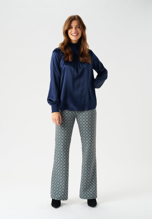 Blouse with upright collar and smock details on both cuffs, collar and top of body.